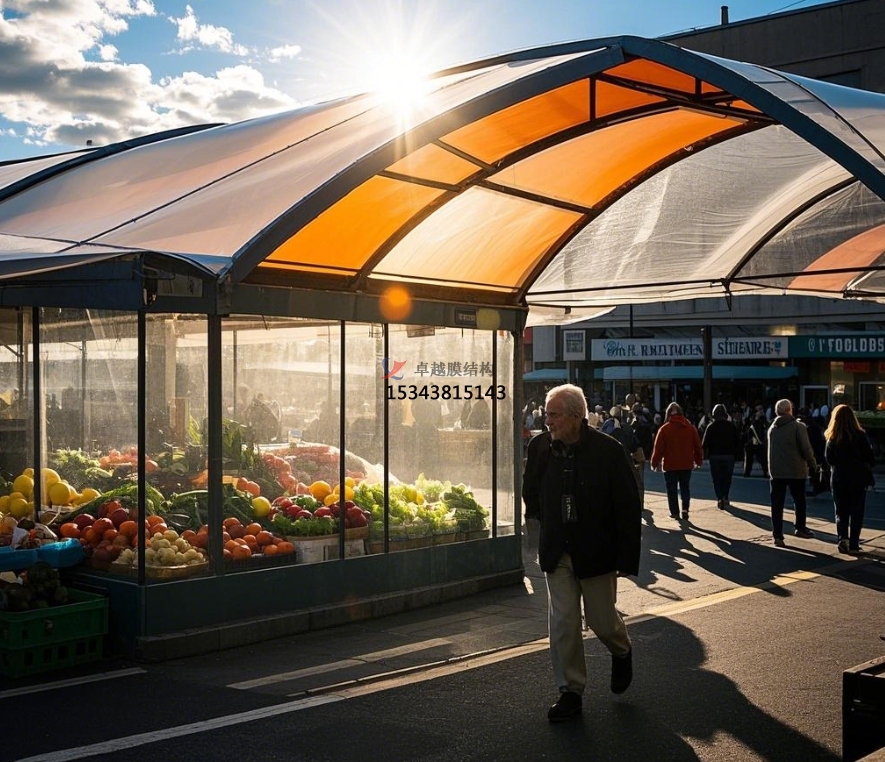 在采光與通風(fēng)上,膜結(jié)構(gòu)頂棚相同體現(xiàn)出色。多數(shù)膜材具有杰出的透光性,可讓天然光線柔軟地灑入商場內(nèi)部。這種天然采光不只節(jié)約了電力照明本錢,營建出明亮舒適的購物環(huán)境,還能讓顧客更明晰地挑選新鮮食材。一起,膜結(jié)構(gòu)頂棚的開放性與靈敏的空間布局,有利于空氣天然流通,有用驅(qū)散商場內(nèi)的異味與熾熱,保持空氣新鮮,減少細(xì)菌滋生,為顧客與商戶發(fā)明健康的環(huán)境。