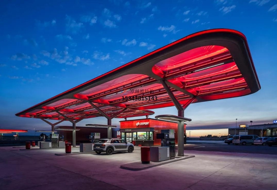 多樣的造型設(shè)計(jì):膜結(jié)構(gòu)罩棚的設(shè)計(jì)極具靈活性,能夠根據(jù)加油站的整體風(fēng)格和周邊環(huán)境,設(shè)計(jì)出各種獨(dú)特的造型。無(wú)論是簡(jiǎn)潔流暢的弧形,還是富有現(xiàn)代感的雙曲面,亦或是模仿自然形態(tài)的仿生造型,都能為加油站增添獨(dú)特的魅力。例如,一些位于旅游景區(qū)附近的加油站,采用了與周邊自然景觀相融合的膜結(jié)構(gòu)罩棚設(shè)計(jì),成為了當(dāng)?shù)匾坏懒聋惖娘L(fēng)景線。