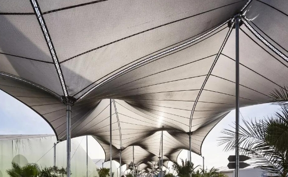 索膜結(jié)構(gòu)建筑的優(yōu)勢特點:其優(yōu)勢特點有大跨度無柱空間、輕質(zhì)節(jié)能、快速施工、藝術(shù)表現(xiàn)力、造型自由、節(jié)能環(huán)保、抗風(fēng)抗震強、透光性好、維護(hù)成本低等。大跨度無柱空間表現(xiàn)在其能突破傳統(tǒng)結(jié)構(gòu)限制,覆蓋面積可達(dá)數(shù)萬平方米(如青島頤中體育場3萬㎡屋面)。輕質(zhì)節(jié)能表現(xiàn)在其自重僅為傳統(tǒng)建筑的1/30,減少基礎(chǔ)造價;透光膜材降低日間照明能耗??焖偈┕?zwnj;主要指工廠預(yù)制膜片與索構(gòu)件,現(xiàn)場組裝效率高,工期可比傳統(tǒng)建筑縮短75%。藝術(shù)表現(xiàn)力是指曲面造型自由靈動,如大阪世博會盧森堡館以莫比烏斯帶為靈感的膜結(jié)構(gòu),兼具投影載體功能。造型自由,能根據(jù)設(shè)計師的靈感,實現(xiàn)各種曲面、弧形等獨特造型,讓建筑物更具藝術(shù)性。節(jié)能環(huán)保,使用材料較少,制造過程能耗低,膜材透光性好,可大幅減少白天人工照明需求。施工快速,材料輕便,通常通過預(yù)制組件進(jìn)行安裝,施工周期短,能節(jié)省人工和時間成本??癸L(fēng)抗震強,輕質(zhì)和柔性特點使其在面對風(fēng)力或地震時能分散外力,減少直接沖擊,提升安全性。透光性好,膜材的透光性可為建筑提供所需照度,創(chuàng)造出自然漫射光的室內(nèi)空間視覺環(huán)境,夜晚還可成為光的雕塑。維護(hù)成本低,一些膜材如 PTFE 膜材抗老化性能好,壽命長,且膜面光滑,灰塵等不易附著,經(jīng)雨水沖刷可恢復(fù)清潔。