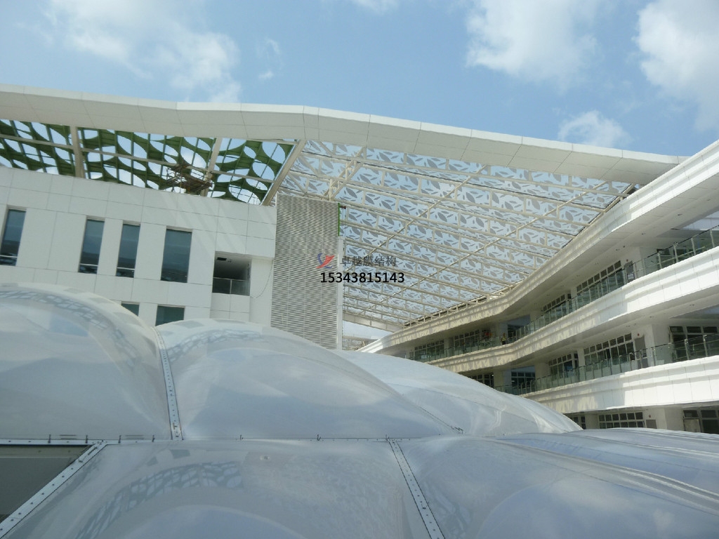 1.造型多變。吳忠ETFE膜結(jié)構(gòu)與其他膜結(jié)構(gòu)稍稍有些不同,它采用一小片一小片的ETFE膜材料安裝在多變的鋼構(gòu)件中,其造型可根據(jù)鋼構(gòu)件的造型而變,如:伊甸園的六邊形,水立方的不規(guī)則形狀等,賦予了建筑鮮活的生命,讓人一眼便能記住。