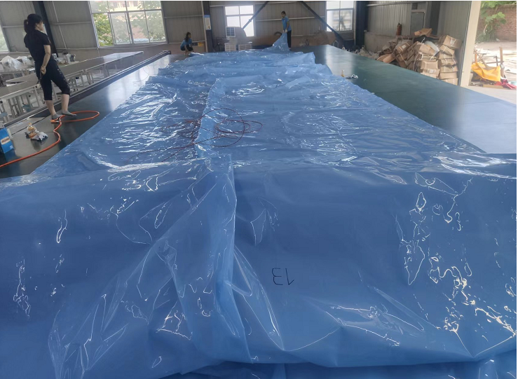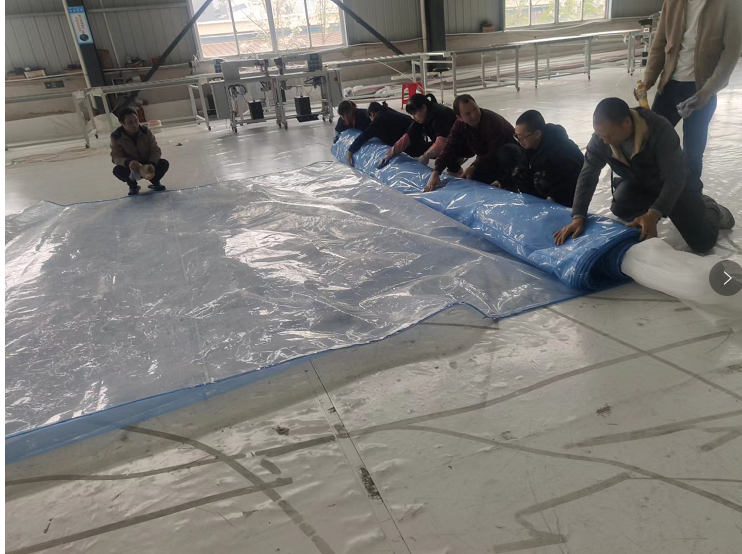 焊接完成,人工收卷,200平方一個(gè)氣枕,用了8個(gè)才卷起來。