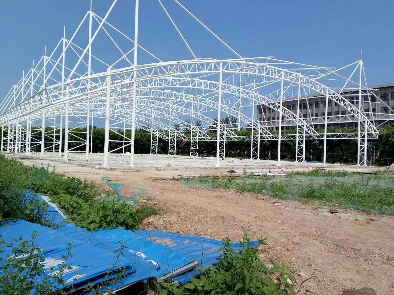 籃球場膜結(jié)構(gòu)工程施工流程與關(guān)鍵技術(shù):其流程包含支撐結(jié)構(gòu)安裝(以鋼結(jié)構(gòu)為例)、膜材加工與安裝、 膜面張拉與調(diào)整、節(jié)點(diǎn)處理與防水密封。在關(guān)鍵技術(shù)點(diǎn)中,支撐結(jié)構(gòu)的安裝涵蓋構(gòu)件吊裝,按施工順序吊裝鋼柱、鋼梁,使用經(jīng)緯儀和水準(zhǔn)儀控制垂直度和標(biāo)高,臨時(shí)固定后進(jìn)行焊接或螺栓連接。焊工需持證上崗,焊接前清理焊口,采用多層多道焊,焊后進(jìn)行焊縫探傷檢測(如超聲波檢測),確保焊接質(zhì)量。焊接部位及損傷的防腐層需重新涂刷防銹漆和面漆,涂層厚度符合設(shè)計(jì)要求。膜材加工與安裝,膜材的加工需要根據(jù)深化設(shè)計(jì)圖紙,在工廠內(nèi)對膜材進(jìn)行裁剪、熱合(或縫合),形成完整的膜單元。加工完成后進(jìn)行預(yù)拼裝(預(yù)張力測試),檢查膜面尺寸、形狀是否符合設(shè)計(jì)要求,記錄膜材的張拉方向和定位標(biāo)記。然后進(jìn)行膜材吊裝,采用多點(diǎn)吊裝法,使用專用吊具(如尼龍吊帶)避免膜材損傷,吊裝過程中需專人指揮,確保膜面平穩(wěn)展開。先將膜材邊緣與支撐結(jié)構(gòu)上的夾具臨時(shí)固定,再逐步張拉至設(shè)計(jì)位置。在膜面張拉與調(diào)整中,首先注意張拉順序,遵循 “由中間向四周” 或 “對稱張拉” 原則,分階段逐步施加預(yù)張力,避免膜面局部應(yīng)力集中。然后是張力控制,使用張力計(jì)實(shí)時(shí)監(jiān)測膜面張力值,達(dá)到設(shè)計(jì)張力值的80%后暫停張拉,靜置24小時(shí)讓膜材應(yīng)力松弛,再進(jìn)行二次張拉至設(shè)計(jì)值。最后是形態(tài)調(diào)整,張拉過程中觀察膜面是否平整,有無褶皺或積水隱患,通過調(diào)整支撐結(jié)構(gòu)的位移或夾具位置優(yōu)化膜面形態(tài)。在節(jié)點(diǎn)處理與防水密封中,膜材與鋼結(jié)構(gòu)連接采用夾具固定(如鋁合金夾具),螺栓間距控制在200-300mm,確保連接牢固。膜材之間的拼接縫采用熱合焊接,焊縫寬度不小于50mm,焊接后進(jìn)行氣密性檢測。最后進(jìn)行防水處理,在膜結(jié)構(gòu)邊緣與建筑主體連接處設(shè)置防水卷材或密封膠,防止雨水滲漏。排水坡度需≥5%,確保膜面雨水能迅速排至天溝或地漏。