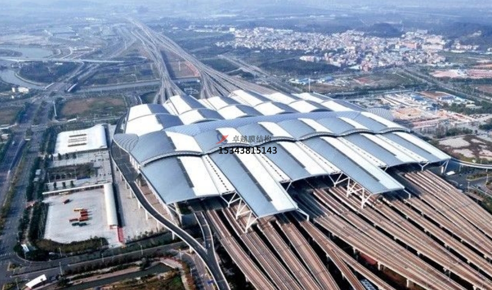 廣州白云站彩色PTFE膜結(jié)構(gòu)項(xiàng)目,單個(gè)膜花瓣單元采用白色和彩色膜材拼接技術(shù)。結(jié)構(gòu)上采用上下起伏的花蕾構(gòu)造,這使得膜材在張拉過(guò)程中,需要充分考慮摩擦對(duì)本項(xiàng)目預(yù)張力施加的困難。同時(shí)因?yàn)閱蝹€(gè)裁剪單元細(xì)長(zhǎng),寬度最寬約1.2m,長(zhǎng)度大37m,其沿線長(zhǎng)度方向整體需要焊接,所以焊接的應(yīng)力對(duì)本項(xiàng)目的影響尤為明顯。針對(duì)以上難點(diǎn),膜材進(jìn)場(chǎng)后,采用最先進(jìn)的雙軸拉伸設(shè)備對(duì)本項(xiàng)目的膜材進(jìn)行詳細(xì)的應(yīng)力與應(yīng)變關(guān)系的測(cè)試實(shí)驗(yàn),確保每一批次,每一張膜材在后期焊接接張拉過(guò)程中受力均勻,形態(tài)完美。