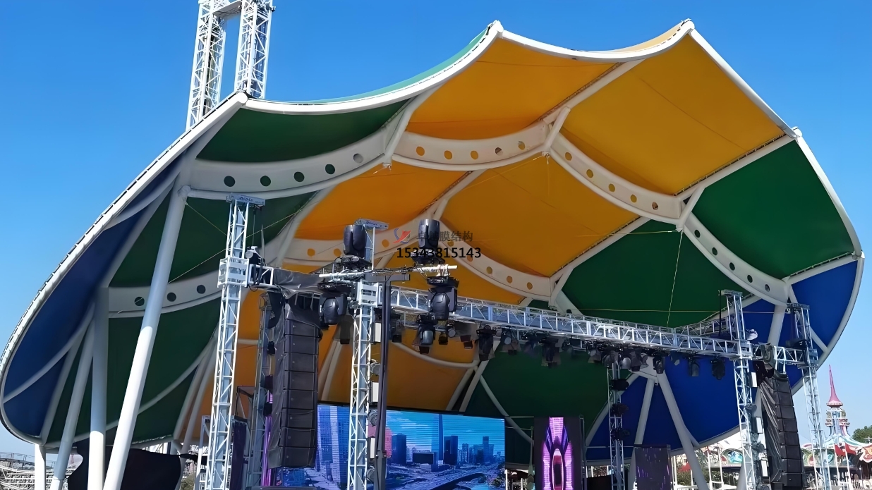 在設(shè)計(jì)膜結(jié)構(gòu)舞臺(tái)時(shí),首要任務(wù)是深入理解演出主題與風(fēng)格。從色彩、造型到整體氛圍營造,都應(yīng)圍繞主題展開。若是一場(chǎng)古典音樂會(huì),膜結(jié)構(gòu)舞臺(tái)可采用簡潔、優(yōu)雅的白色調(diào),搭配流暢的線條,營造出莊重、典雅的氛圍;而對(duì)于現(xiàn)代藝術(shù)展的舞臺(tái),則可以運(yùn)用大膽的色彩和前衛(wèi)的造型,展現(xiàn)出創(chuàng)新與活力。通過精準(zhǔn)的設(shè)計(jì),膜結(jié)構(gòu)舞臺(tái)成為演出主題的視覺延伸,強(qiáng)化藝術(shù)表達(dá)。