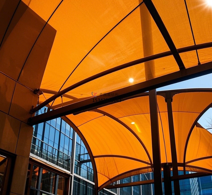 小區(qū)大門膜結構選用的膜材具有出色的物理性能。首先,其防水性能極佳,能有效抵御各種惡劣天氣下的雨水侵襲,為進出小區(qū)的居民遮風擋雨,確保居民在雨天也能干爽通行。其次,膜材的抗紫外線能力很強,能有效阻擋陽光中的有害紫外線,延緩膜材老化,保證大門長期使用后依然能保持良好的外觀和性能。這不僅延長了膜結構大門的使用壽命,降低了維護成本,還為居民提供了一個防曬的過渡空間,減少了陽光直射對人體的傷害。