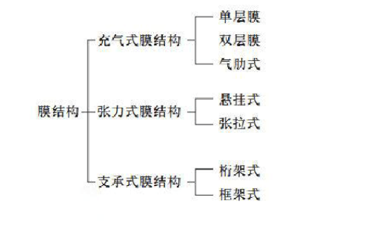 膜結(jié)構(gòu)按結(jié)構(gòu)可分為:骨格式膜結(jié)構(gòu)、張拉式膜結(jié)構(gòu)、充氣式膜結(jié)構(gòu)。
