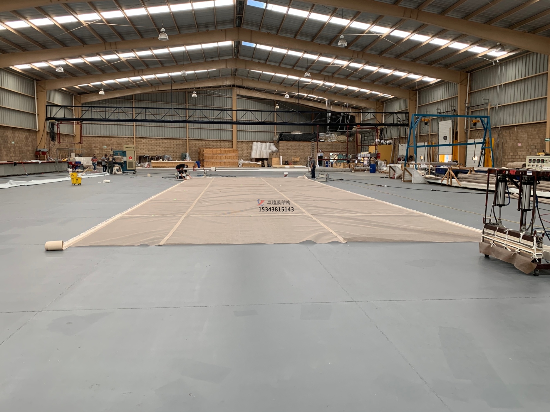 膜結(jié)構(gòu)工程的加工制造膜材的首要加工流程包含: 進(jìn)料-查驗(yàn)?zāi)げ?膜片下料-編號(hào)-膜片編排放樣-膜片初粘-駁接-包裝。因?yàn)槟げ牡牟眉簟b進(jìn)程都較為復(fù)雜, 各種角度改變較多, 且加工精度請(qǐng)求非常高, 所以在制造進(jìn)程中要加強(qiáng)質(zhì)量管理, 保證制造精度。