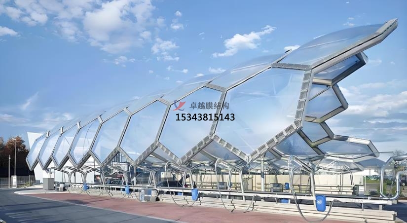 以下是膜結(jié)構(gòu)產(chǎn)品的主要應(yīng)用和特點(diǎn):膜結(jié)構(gòu)自行車棚和機(jī)動車棚,膜結(jié)構(gòu)景觀,膜結(jié)構(gòu)污水池加蓋,膜結(jié)構(gòu)體育場館和展會建筑,膜結(jié)構(gòu)藝術(shù)裝置,膜結(jié)構(gòu)充電樁和收費(fèi)站。膜結(jié)構(gòu)自行車棚采用輕質(zhì)且堅(jiān)固的膜材料,具備優(yōu)異的抗風(fēng)、抗雨雪能力,同時具有自潔性,減少維護(hù)成本。其優(yōu)雅的造型和多樣的色彩選擇,使其成為城市中的一道靚麗風(fēng)景線,而機(jī)動車棚的篷布采用PVC、PVDF、PTFE、ETFE等材料,具有高強(qiáng)度、耐久性好、防火難燃、自潔性強(qiáng)等特點(diǎn)。其透光率為13%,熱能反射率為73%,能有效減少熱吸收,使用壽命可達(dá)15-30年4。膜結(jié)構(gòu)景觀是一種耐用、高強(qiáng)度的涂層織物,具有柔韌的質(zhì)地、重量輕、透光性極佳等特點(diǎn),常被用于公園、廣場等場所,成為吸引眼球的藝術(shù)景觀。隨著工業(yè)污染的加劇,膜結(jié)構(gòu)污水池加蓋因其環(huán)保、施工簡便等優(yōu)勢,逐漸成為工業(yè)污水處理的首選。其鋼材料使用量少,能有效解決池體跨度過大的施工難題。膜結(jié)構(gòu)在體育場館和展會建筑中的應(yīng)用,不僅縮短了建設(shè)工期,降低了造價成本,還減少了環(huán)境污染。其大跨度的設(shè)計(jì)和高透光性,為場館提供了良好的采光和空間感。膜結(jié)構(gòu)藝術(shù)裝置設(shè)計(jì)簡單、造型獨(dú)特,不僅具有藝術(shù)展示效果,還能為人們提供休息場所,廣泛應(yīng)用于公園、景區(qū)等場所。膜結(jié)構(gòu)充電樁和收費(fèi)站以其耐用性和美觀性,成為現(xiàn)代城市基礎(chǔ)設(shè)施的重要組成部分,為人們提供便捷服務(wù)的同時,也大大提升了城市形象。