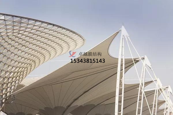 膜結(jié)構(gòu)遮陽棚由立柱和頂棚構(gòu)成。立柱多由金屬合金制作,如鋼,鋁等,質(zhì)量輕且質(zhì)地硬,頂棚則是由膜結(jié)構(gòu)材料制成。