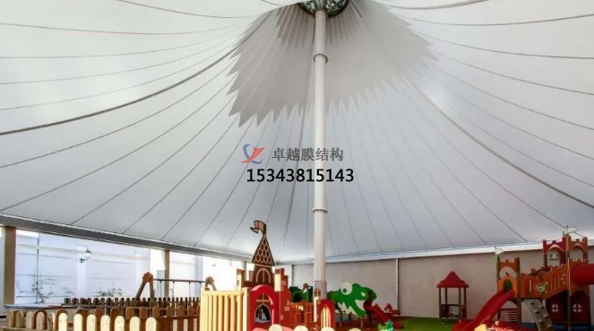 這是一個(gè)超450平米的兒童游樂(lè)場(chǎng),于上方覆蓋一把膜結(jié)構(gòu)“大傘",采用白色PVC膜材,大傘中央以一根鋼管支撐,營(yíng)造了一個(gè)明亮開闊無(wú)遮擋的安全性空間。