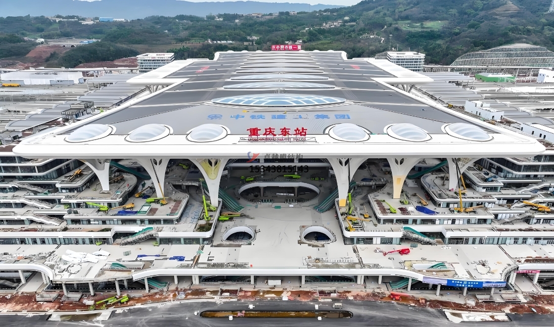 3. 重慶東站‌:正在建設(shè)的重慶東站屋蓋體系采用了“管桁架鋼結(jié)構(gòu)+橢圓形天窗+樹(shù)形支撐柱+ETFE氣枕膜”形式。這種設(shè)計(jì)不僅實(shí)現(xiàn)了大跨度的覆蓋,還通過(guò)ETFE氣枕膜的應(yīng)用為整個(gè)項(xiàng)目增添了獨(dú)特的視覺(jué)效果。