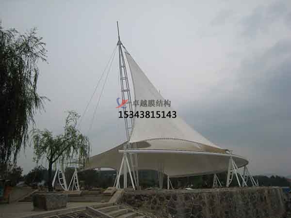 膜結(jié)構(gòu)景觀,是以建筑織物,即膜材料為張拉主體,與支撐構(gòu)件或拉索共同組成的結(jié)構(gòu)體系,它以其新穎獨(dú)特的建筑造型,良好的受力特點(diǎn)——成為大跨度空間結(jié)構(gòu)的主要形式之一。膜材料是指聚酯纖維基布或PVDF、PVF、PTFE等不同的表面涂層,配以優(yōu)質(zhì)的PVC組成的具有穩(wěn)定的形態(tài),并可承受一定載荷的建筑紡織品。它的壽命因不同的表面涂層而異,一般可達(dá)成10-20年。