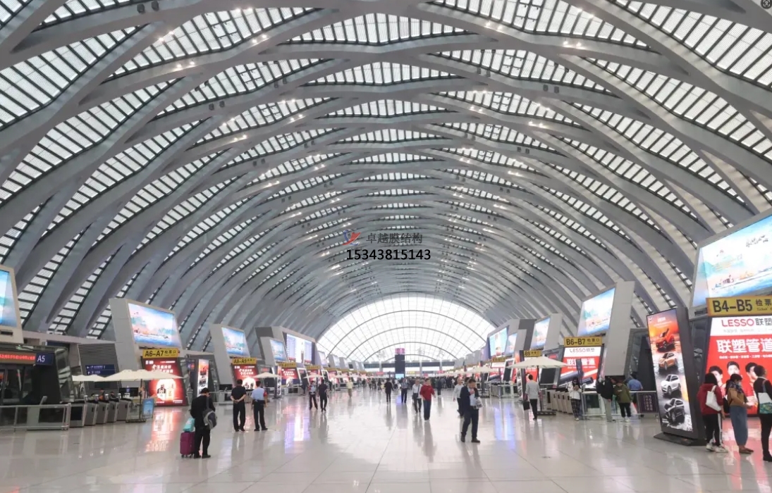 在機(jī)場(chǎng),膜結(jié)構(gòu)被廣泛應(yīng)用于航站樓的各個(gè)部位。例如,機(jī)場(chǎng)的到達(dá)和出發(fā)遮陽(yáng)蓬、候機(jī)樓內(nèi)的膜結(jié)構(gòu)吊頂?shù)?,都采用了膜結(jié)構(gòu)技術(shù)。這些膜結(jié)構(gòu)不僅為旅客提供了舒適的候機(jī)環(huán)境,還通過其獨(dú)特的造型和透光性,將陽(yáng)光過濾成柔和的散射光源,營(yíng)造出溫馨而明亮的氛圍。