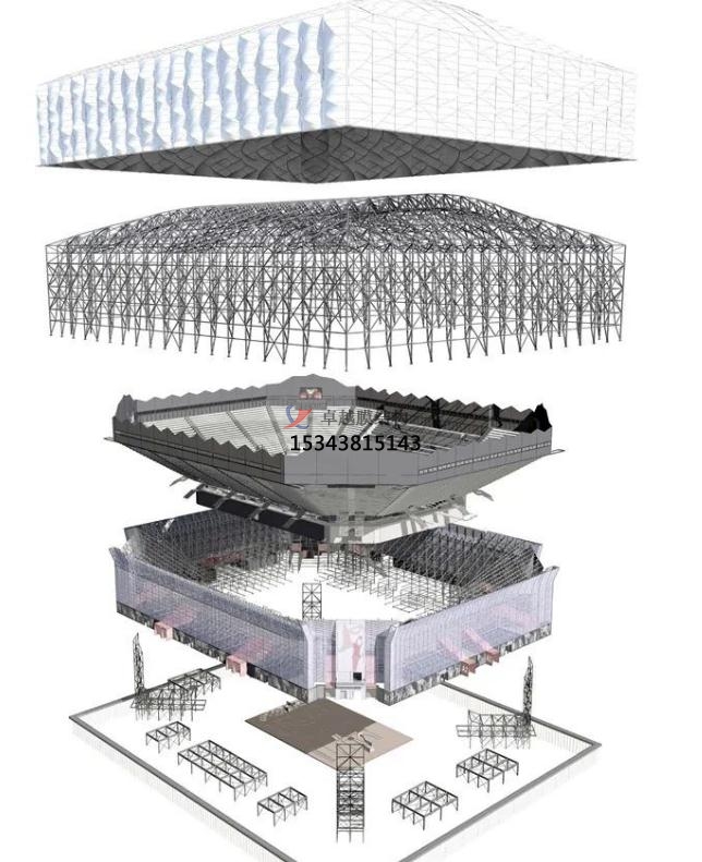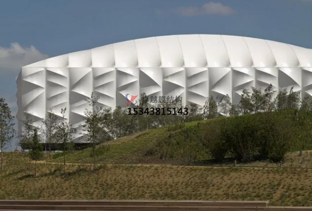 場館高30m,面積兩萬平方米,外敷可收回PVC膜,膜在后面的結(jié)構(gòu)的效果下構(gòu)成美麗的崎嶇。透光的外表皮能夠使得場館在白天能夠十分少的依賴人工照明。