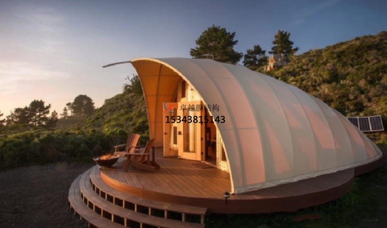 圓頂帳篷酒店:圓潤的穹頂設(shè)計(jì)極具現(xiàn)代感,如武漢木蘭草原伊爾那非伽野奢沙漠酒店的尖頂 Glamping 帳篷。這類帳篷空間布局緊湊合理,通常配備大面積透明窗戶或天窗,既能引入充足自然光線,又方便客人觀賞戶外景色,營造出溫馨又獨(dú)特的居住氛圍。