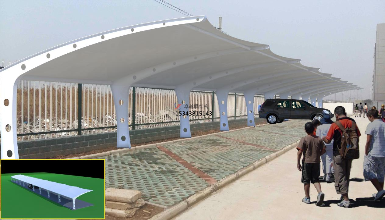 膜結(jié)構(gòu)停車棚一般都是采用反射隔熱的材料. 采用專業(yè)生產(chǎn)的膜結(jié)構(gòu)這樣骨架構(gòu)成.能夠?qū)⑵?、自行車等車全部覆蓋,從根本上解決遮陽遮雨的問題.不僅能將90%的紫外線和紅外線等熱源阻止.還能防止光對車體的傷害.特別是在炎熱的夏季能夠保證車內(nèi)的溫度不會太高,從而降低了車體受到外界的污染;這樣也就延長了車的使用壽命。